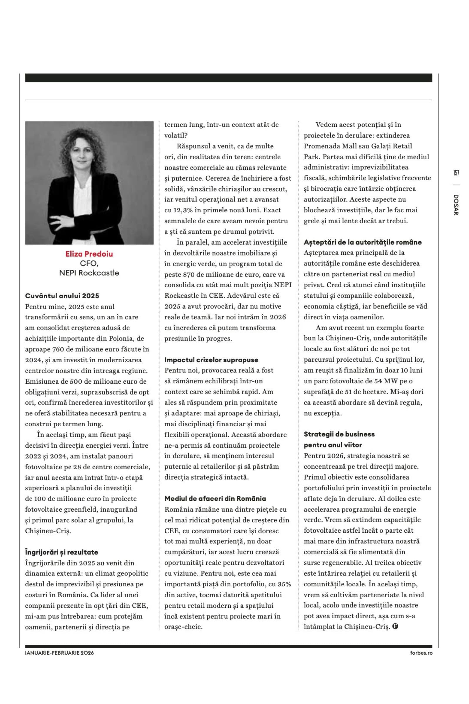 Eliza Predoiu, FCCA, CFO of NEPI Rockcastle, outlines in Forbes Romania how we enter 2026 from a position of strength, following a year of meaningful transformation.